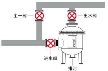 設(shè)備安裝形式應(yīng)為旁通式安裝,以滿足在不停機(jī)狀態(tài)下檢修設(shè)備及反沖洗復(fù)活濾體的需要。